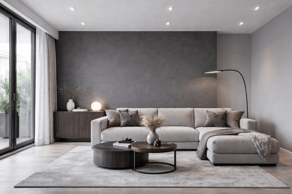 Графитовый диван или секционный модульный диван в тёмно-сером оттенке — классика современной гостиной. Его сочетание с бежевым ковром, деревянными полками и металлическими светильниками создаёт завершённый образ. Такой интерьер легко поддерживать в актуальном виде, просто меняя текстиль и декор по сезону.