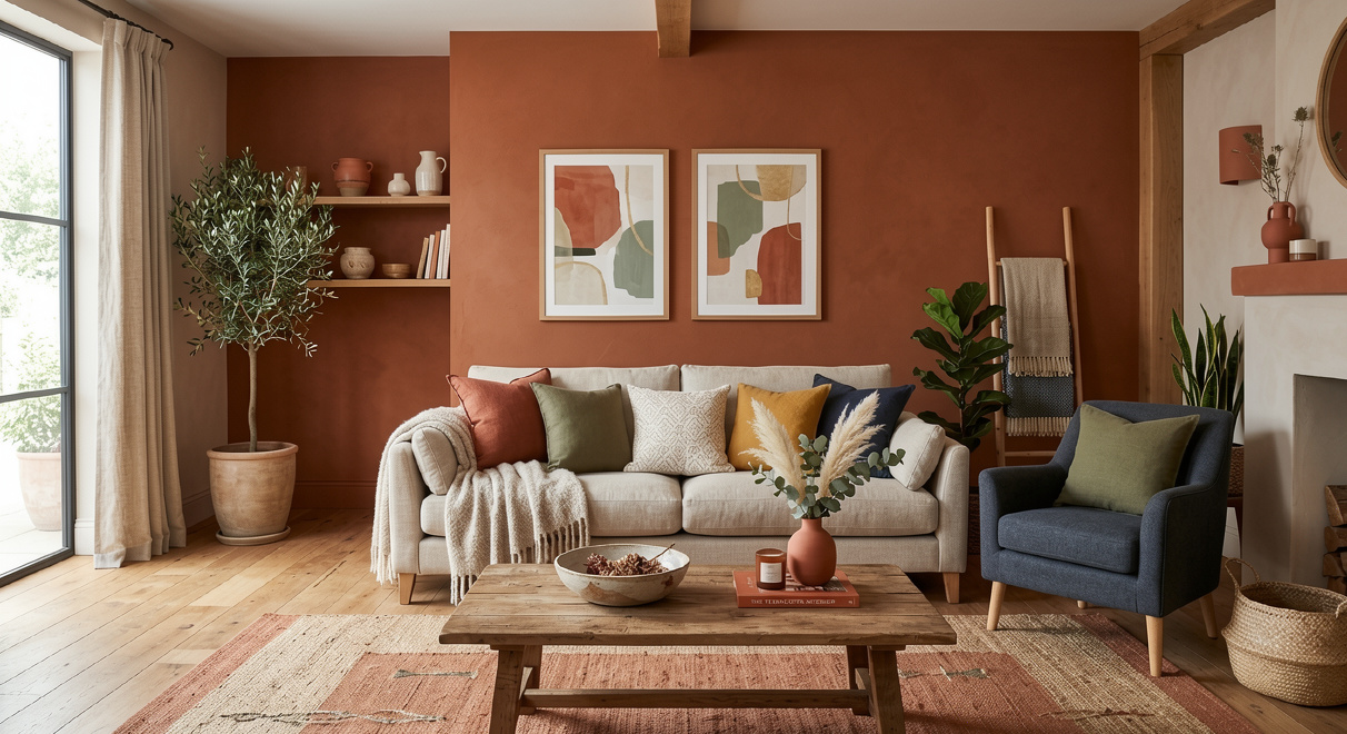 Терракот требует аккуратного дозирования. Если покрыть им все стены, пространство начнет давить. Лучше выбрать одну акцентную стену, использовать терракот в текстиле, декоре. Оттенок хорошо работает в деталях: подушки, пледы, керамические вазы, рамки для фото, небольшие ковры. Такие элементы оживляют комнату без перенасыщения. В 2024 году тренд сместился в сторону приглушенных, пыльных вариантов.