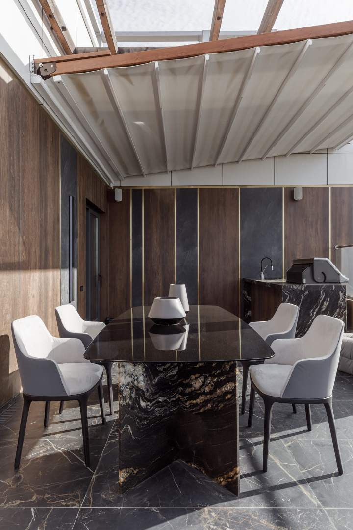 Шикарный пентхаус, площадью 182 м2 с двуми террасами 64м2. Каждая деталь интерьера была тщательно продумана, чтобы создать неповторимую атмосферу комфорта и роскоши. При воплощении данного проекта были использовали только премиальные материалы. В отделке присутствуют натуральный камень и дерево, слэбы керамогранита и многое другое.