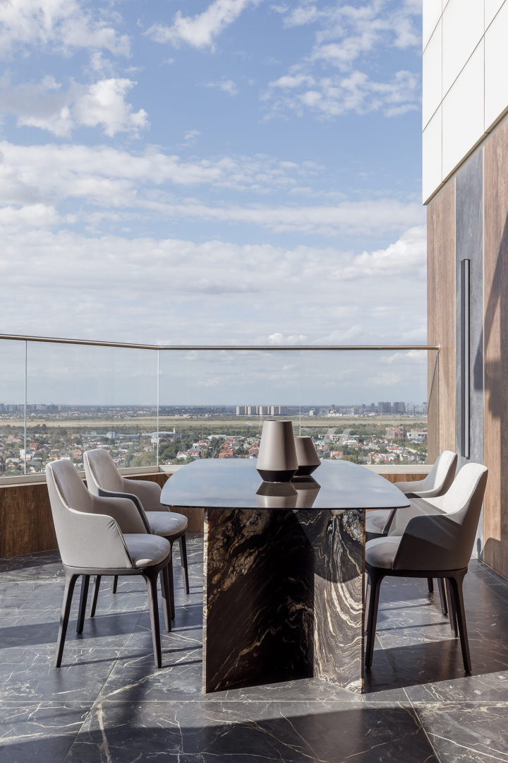 Важной особенностью данной квартиры является потрясающий панорамный вид на город. Вы сможете наслаждаться городским пейзажам из окон или на террасе, где организовано пространство для отдыха и развлечений. Здесь расположилась зона барбекю, а также джакузи.