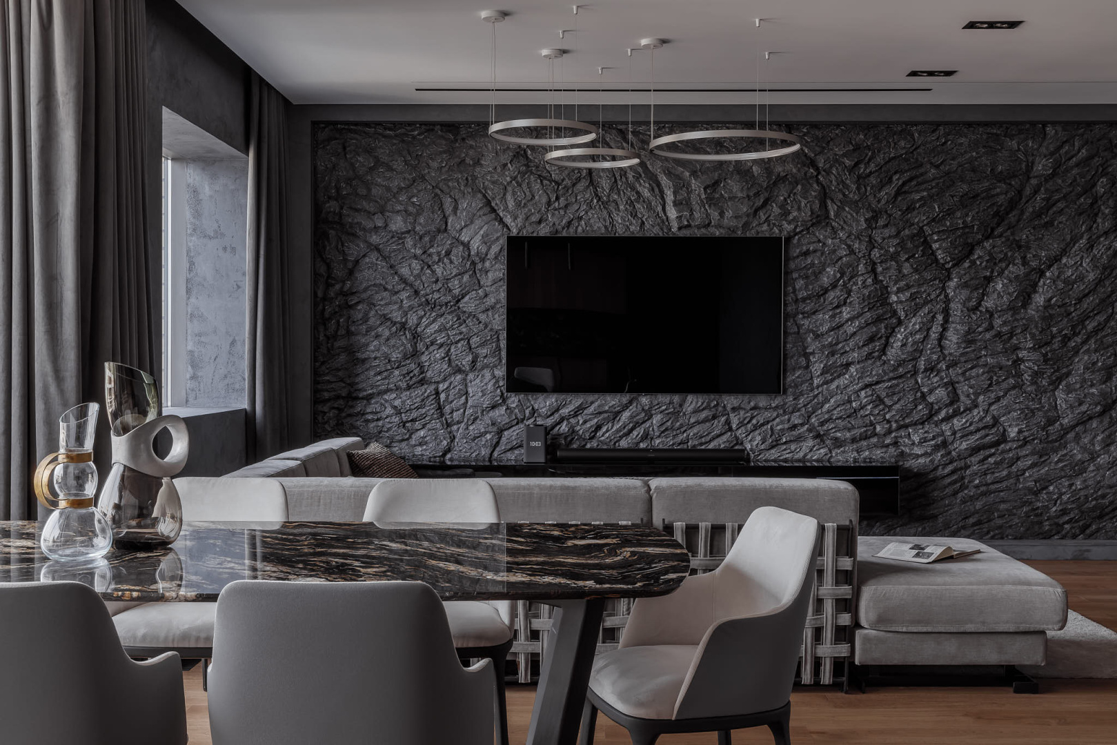 Кухня - гостиная является сердцем этой квартиры, а стена в зоне ТВ, выполненная под натуральную скалу, визитной карточкой интерьера.