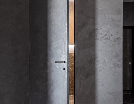 В отделке стен также использовалась высококачественная окраска, декоративная штукатурка, слэбы керамогранита и мягкие декоративные панели. На полу - инженерная доска и керамогранит. Потолок выполнен из гипсокартона на теневом профиле и окрашен.